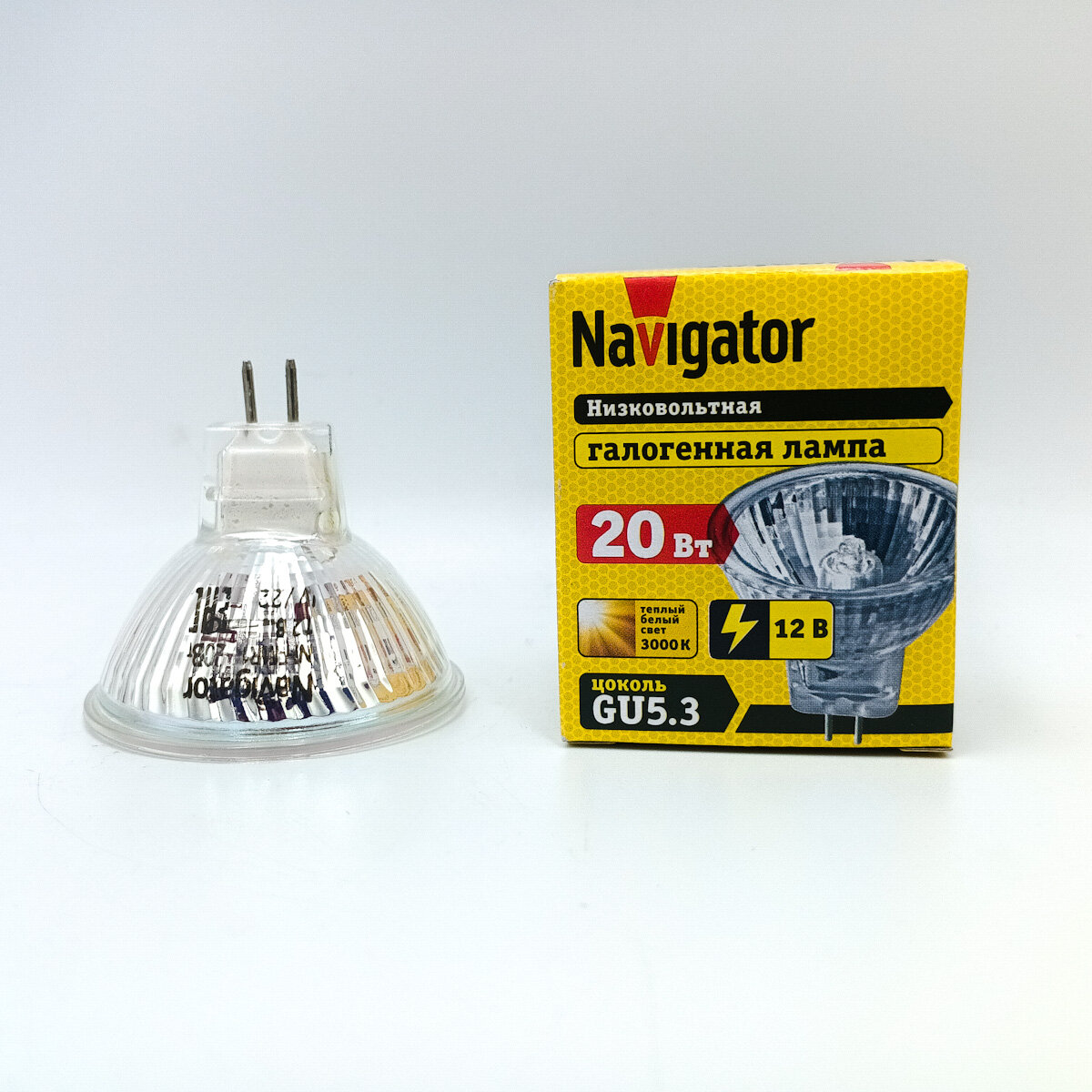 Лампочки (3 шт.) Низковольтная галогенная лампочка Navigator MR16, мощность 20 Вт, напряжение питания 12 В, цветовая температура 3000 К, теплый белый свет, цоколь GU5.3, диммируемая, размер 51х50 мм