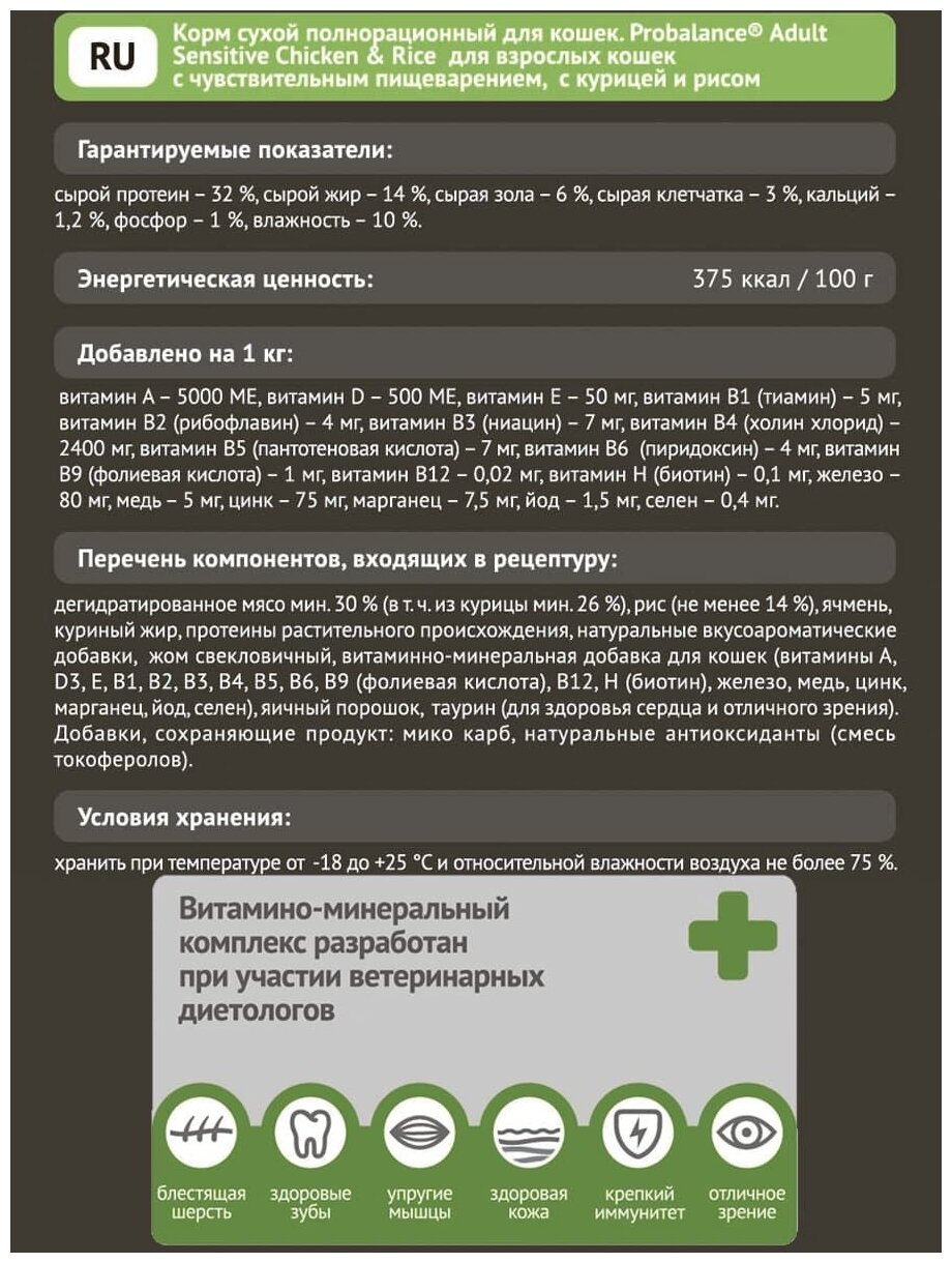 Лучшие цены. Сухой корм Probalance "Sensitive"- специальный премиальный рацион для кошек с чувствительным пищеварением и склонных к аллергии. Корм выполнен из натуральных ингредиентов (в основе курица и рис) и подходит для взрослых питомцев всех пород. Пищевая аллергия – одна из самых частых причин недомогания животных, с которой сталкиваются ветеринары. Чтобы помочь хвостатым "пациентам", датские практикующие ветврачи разработали специальное питание - корм Probalance "Sensitive" (Пробаланс ". Магазины в вашем городе.