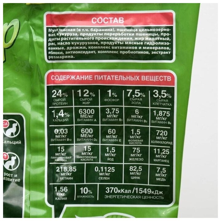 | Ингредиенты | кукуруза, белок птицы 20.5%, рис 16%, ячмень, белок ягненка 4% |