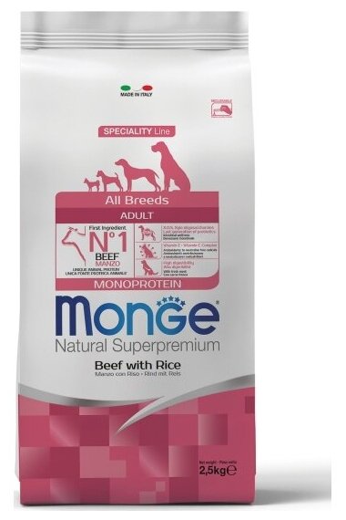 Корм сухой MONGE Dog Monoprotein "All Breeds" для собак всех пород, говядина с рисом 2.5 кг