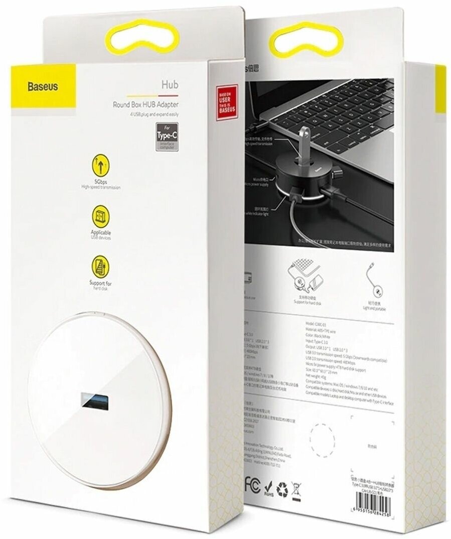 Лучшие цены. Хаб Baseus Round Box решит проблему нехватки USB портов в ноутбуке раз и навсегда. Вставьте его в разъем Type-C, и Вы сразу получить четыре дополнительных USB входа, чтобы одновременно подключать мышку, клавиатуру, джойстик и флешку. Главная его особенность – наличие гнезда microUSB для дополнительного питания, например от зарядки смартфона. Благодаря этому Вы сможете подключать через концентратор к ноутбуку внешний жесткий диск на 4ТБ. Магазины в вашем городе.