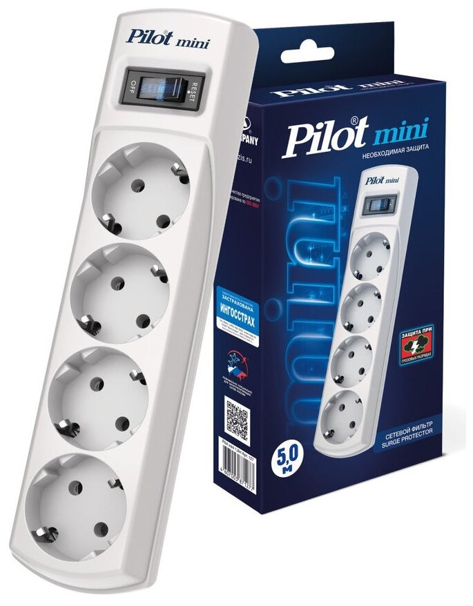 Сетевой фильтр Pilot Mini 5 метров, 4 розетки с заземлением, белый