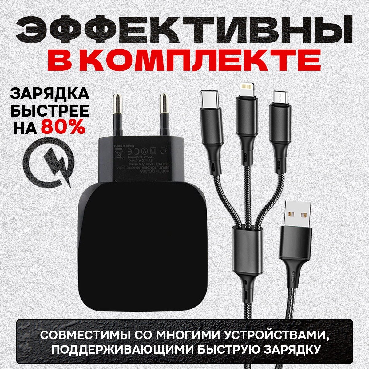 Зарядки для гаджетов Быстрое зарядное устройство с кабелем 3в1 для телефона, сетевой адаптер смартфона, комплект для зарядки, блок питания черный