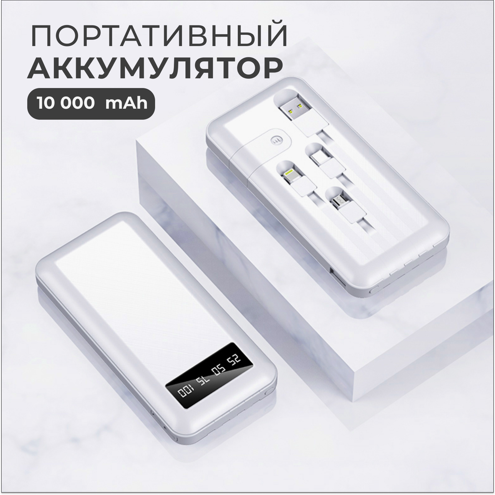 Powerbank Портативный аккумулятор, повербанк 10 000 mAh, внешний аккумулятор со встроенными кабелями USB, Type-c, lightning, micro-usb