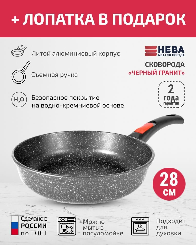 Сковородки Сковорода 28см съемная ручка нева металл посуда Каменная черный гранит с каменным покрытием + Лопатка в подарок