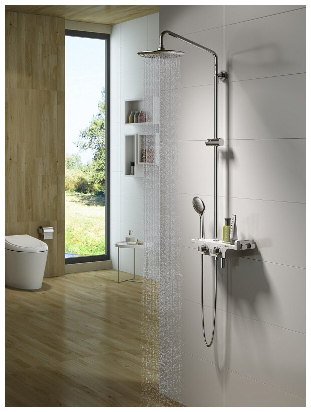 | Комплектация | ручной душ / верхний душ / смеситель / стойка / штанга / душевой шланг / крепление ручного душа / полка (в виде верхней части смесителя) |