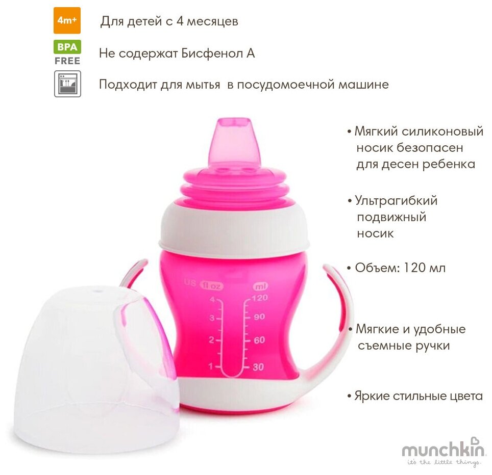 Лучшие цены. Munchkin обучающий поильник-чашка с ручками;4+ 120 мл.; Переход от поильника к взрослой чашке - важный и захватывающий шаг к взрослению и независимости от детской бутылочки для кормления и питья.;Обучающий поильник Munchkin;позволит приучить малыша к самостоятельному питью. Эргономичные ручки будут удобны для ребенка, а при необходимости их можно снять. Особое гибкое основание носика, напоминающее гармошку, позволяет без труда держать поильник под углом и пить, не разливая содержимое. Магазины в вашем городе.