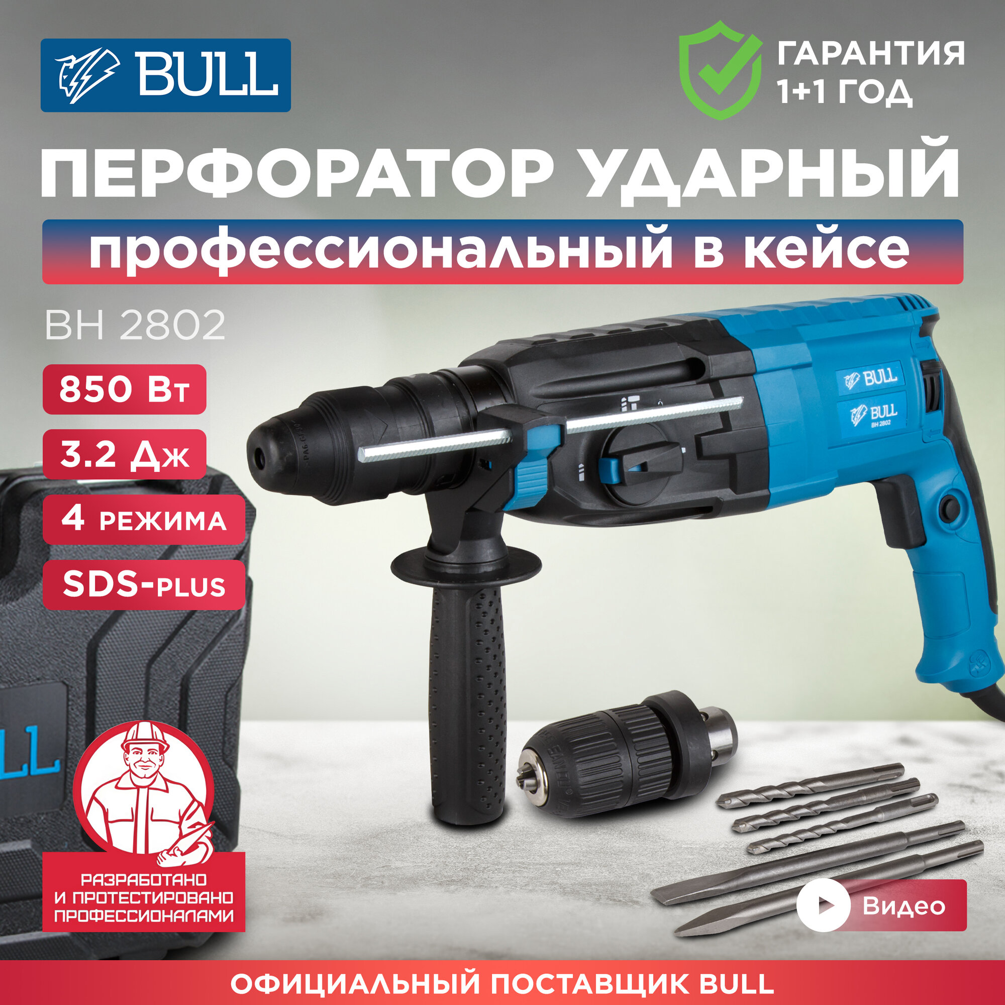 Перфоратор BULL BH 2602 в чем. 800 Вт, 3.0 Дж, 4 реж. + 2 зубила, 3 сверла, БЗП в комплекте (800 Вт, 3.0 Дж, 4 реж., патрон SDS-plus, БЗП в комплекте, 10 650 ₽ Подробнее