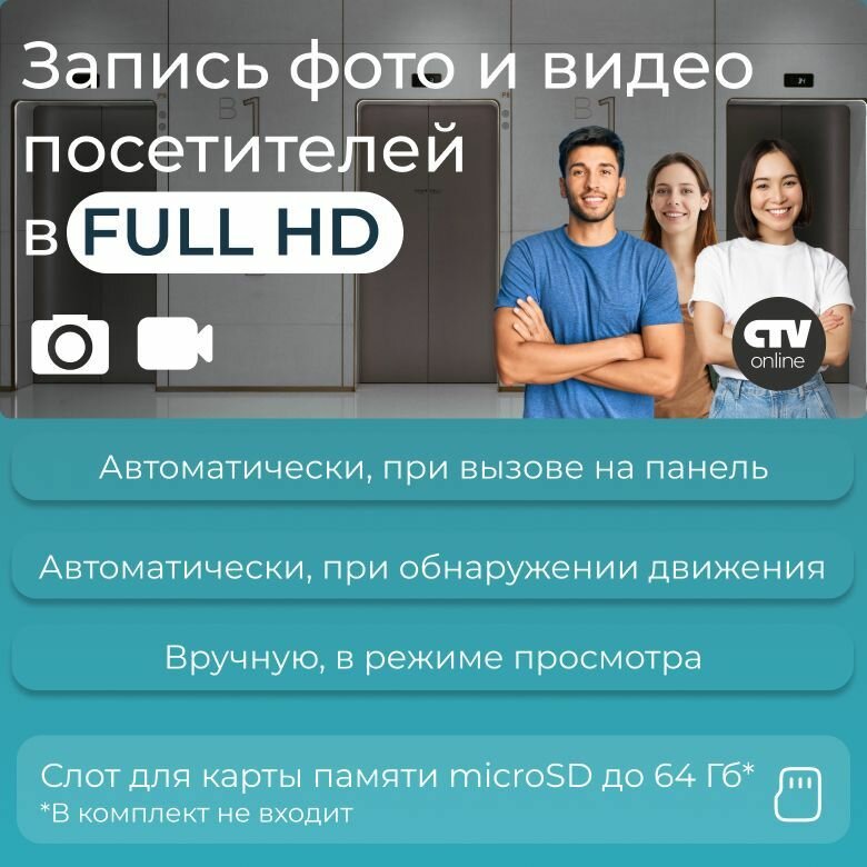 | Дополнительно | Интерком / громкая связь / голосовое сообщение / детектор движения / встроенная память (100 фотографий) / картридер(microSD до 64 ГБ) |