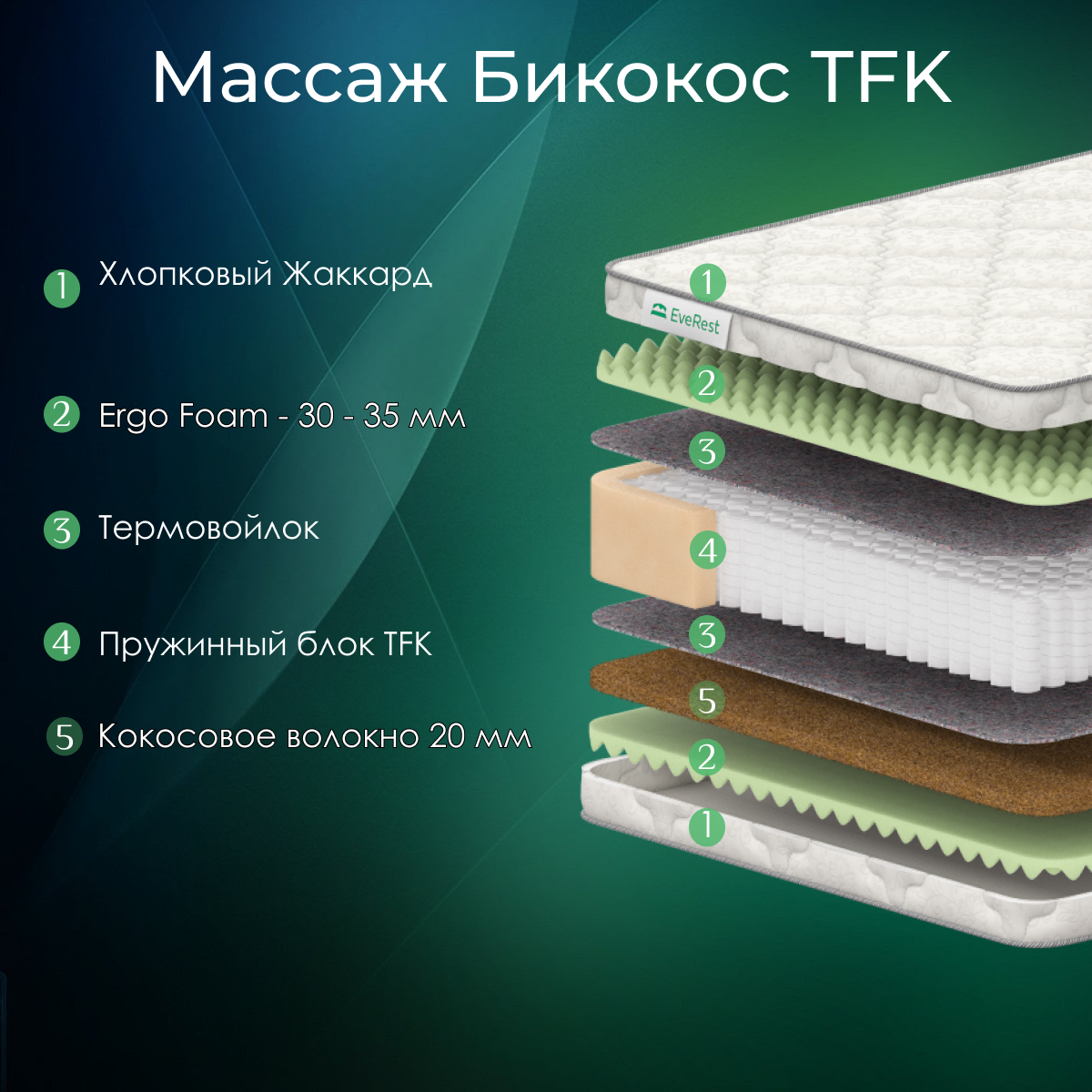 Матрас Everest Пружинный, независмый пружинный блок тфк, 500 пружин, жесткость разная, высота 20 см, название - Массаж Бикокос TFK 165х200 25 610 ₽ Подробнее