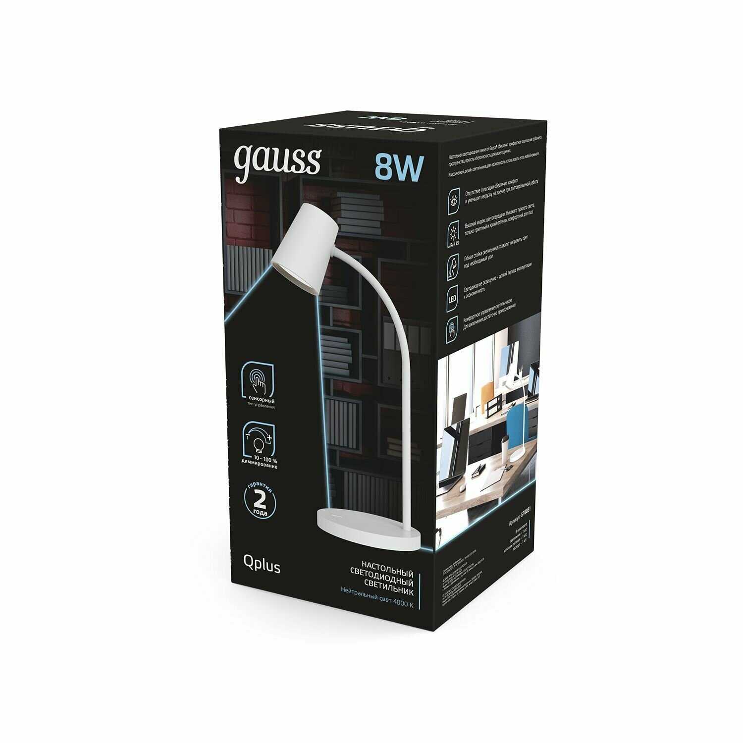 Gauss Светильник настольный Qplus модель 8W 600lm 4000K 170-265V белый диммируемый LED 1/8 GT6031