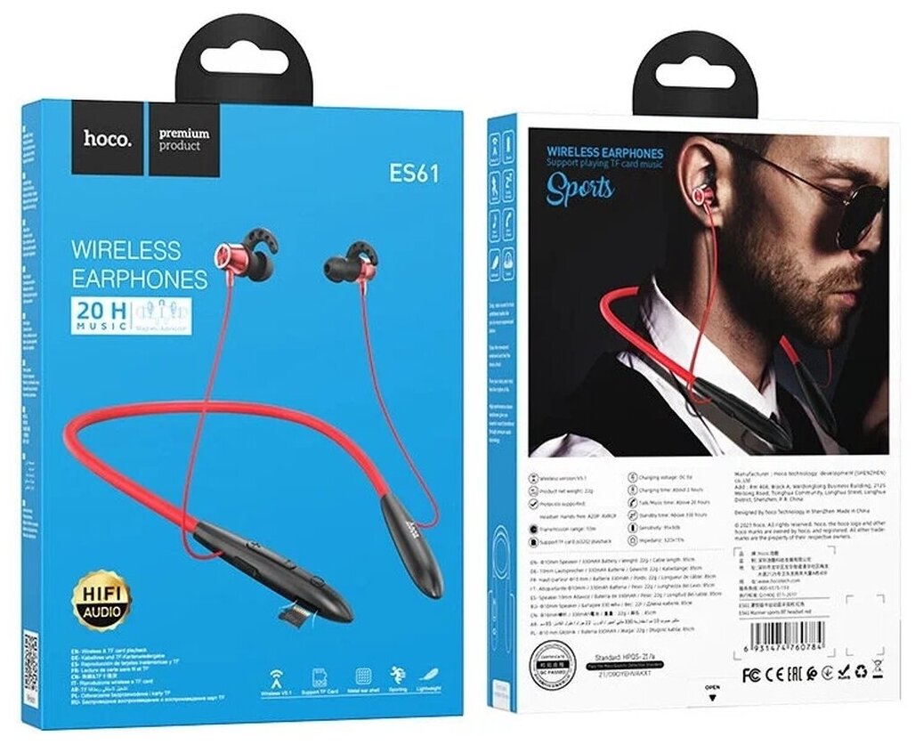 Bluetooth-наушники внутриканальные Hoco ES61 Sports, красные, с микрофоном, 1 шт