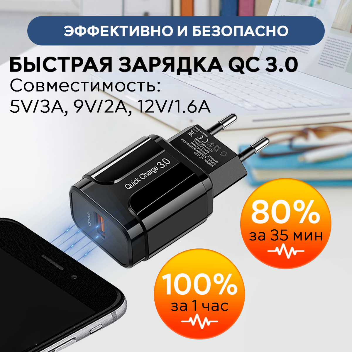 Быстрая зарядка для телефона (18W/QC3.0A) / Сетевой блок питания / Зарядное устройство / Скоростной адаптер /цвет черный 289 ₽ Подробнее