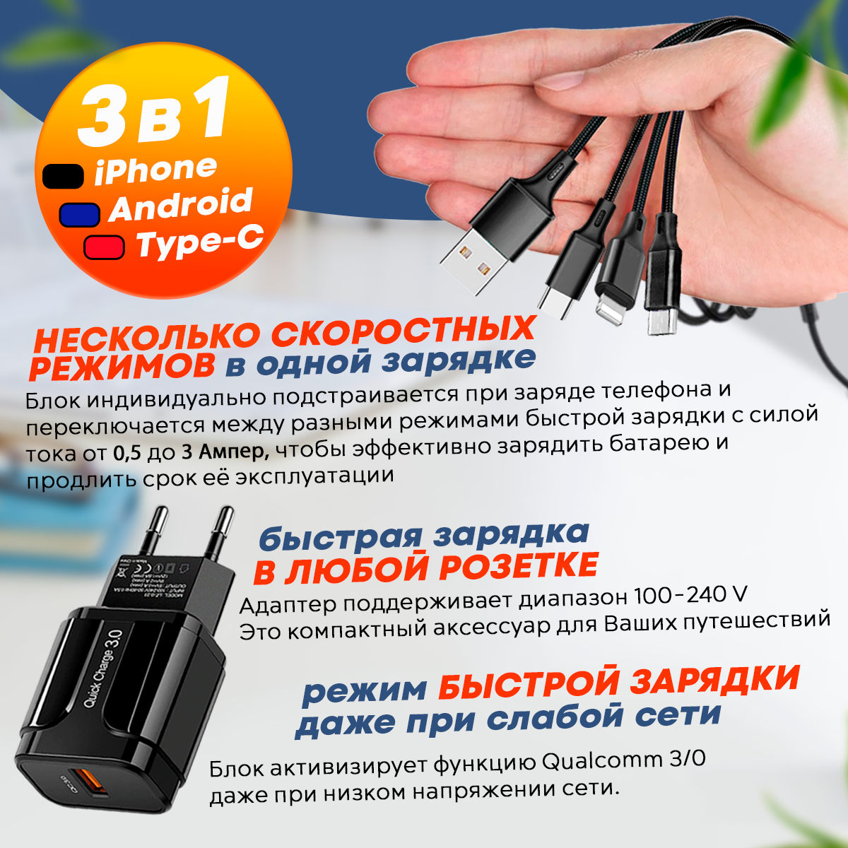 Зарядки для гаджетов Комплект Быстрая зарядка для телефона + кабель 3в1 (18W/QC3.0A) на Android и iPhone / Сетевой блок питания / Скоростной адаптер / цвет черный