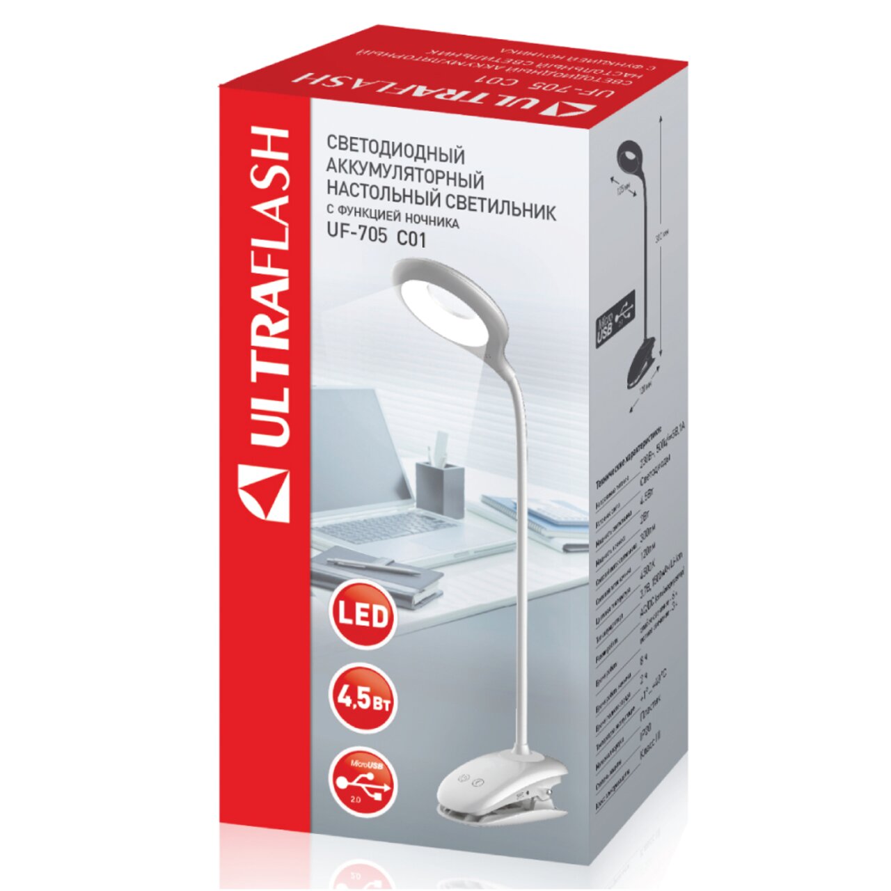 Светильник настольный светодиодный ULTRAFLASH UF-705 C01 аккумуляторный, на прищепке 4,5Вт