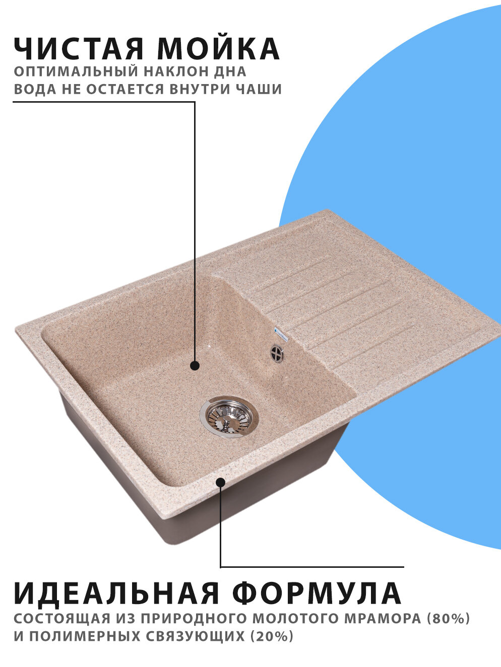 Мойка для кухни из искусственного камня прямоугольная с крылом (73,4x48,3), бежевая 11 311 ₽ Подробнее