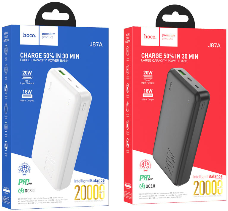 Powerbank Внешний аккумулятор Hoco J87А, 20000 мАч, 1 USB, 1 Type-C, 3 А, дисплей, чёрный