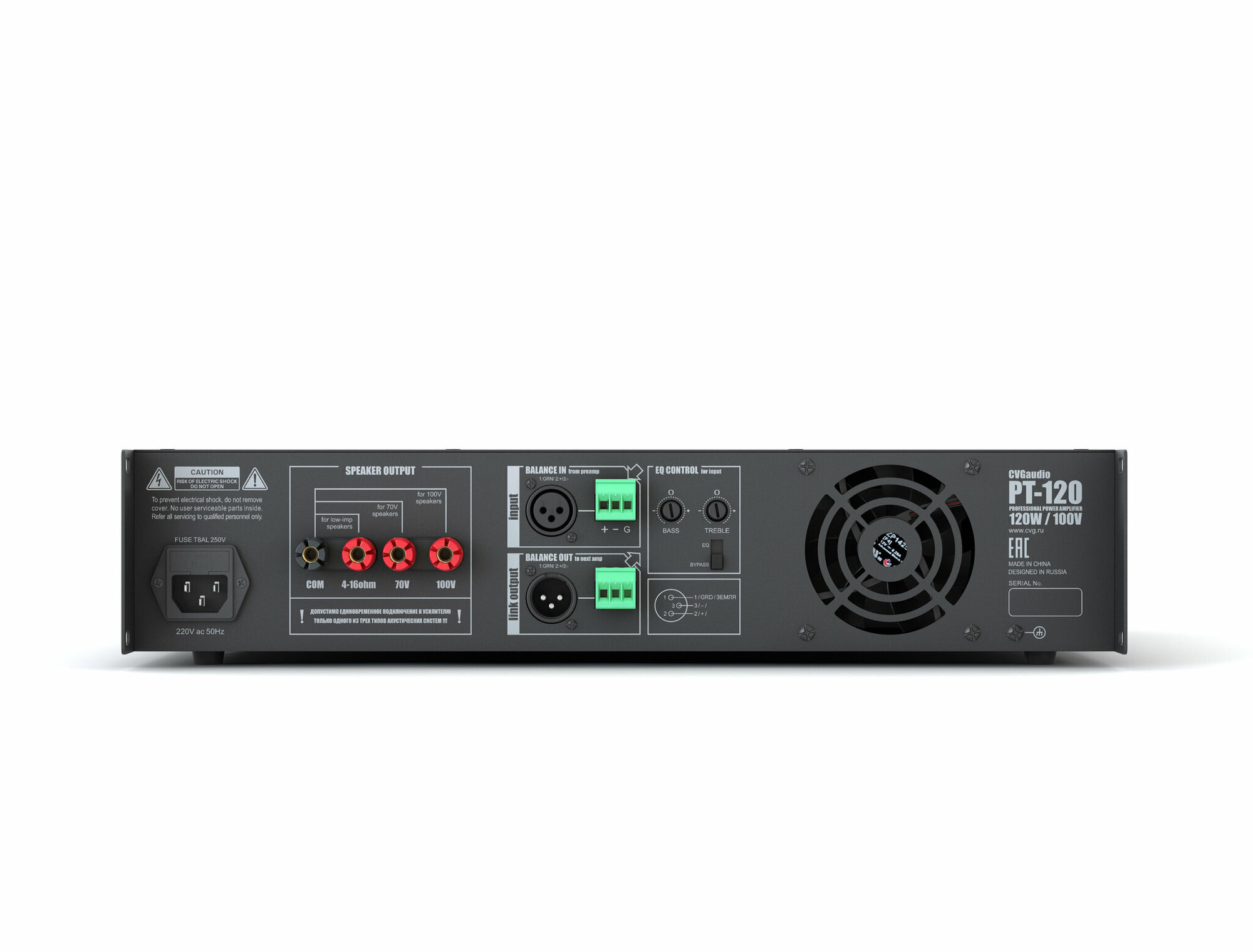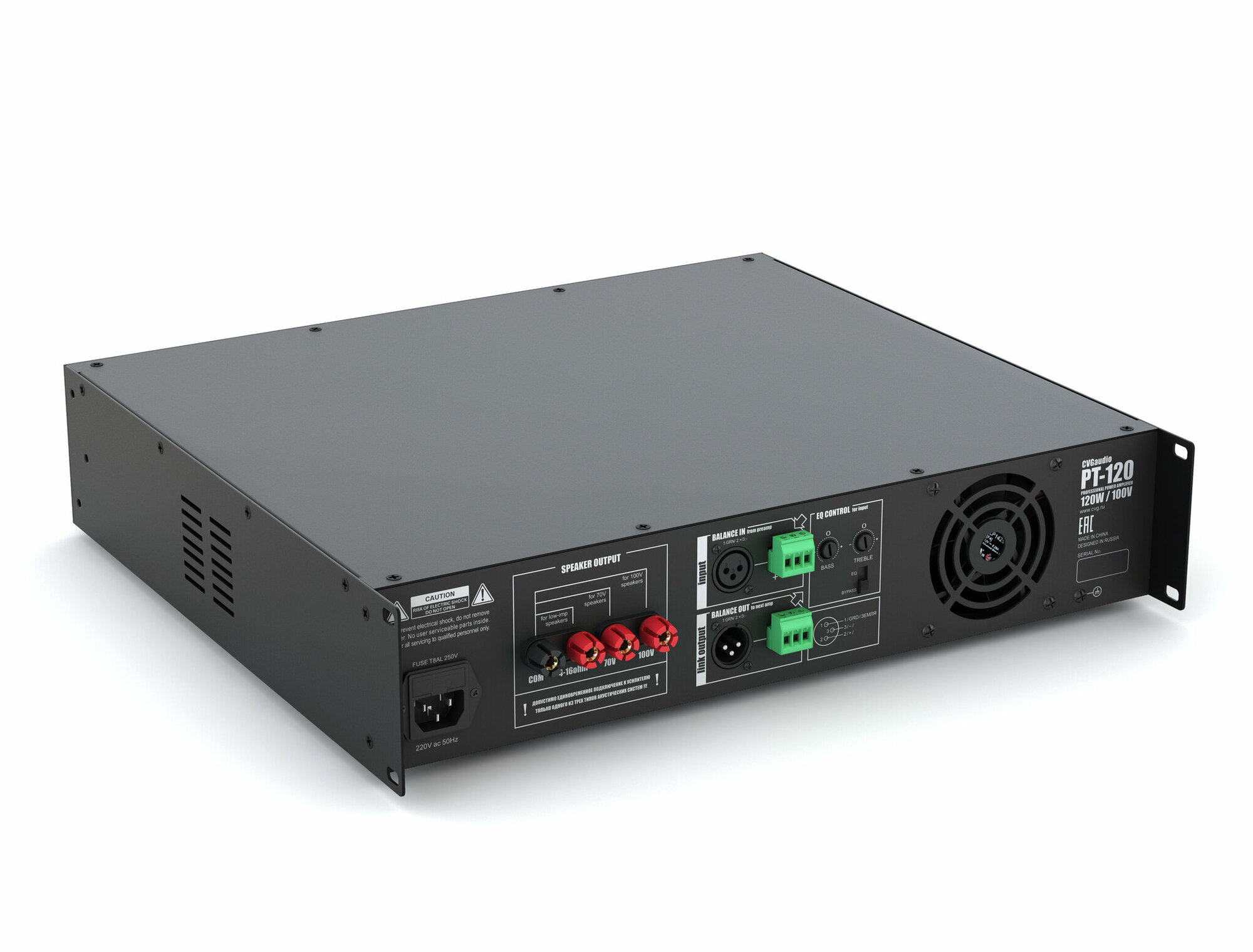 CVGAUDIO PT-120 - Профессиональный высококачественный усилитель мощности для систем трансляции музыки и речевого оповещения, 120W/100V, балансный XLR/Euro Block вход, линкующий XLR /Euro Block балансный выход, 2U