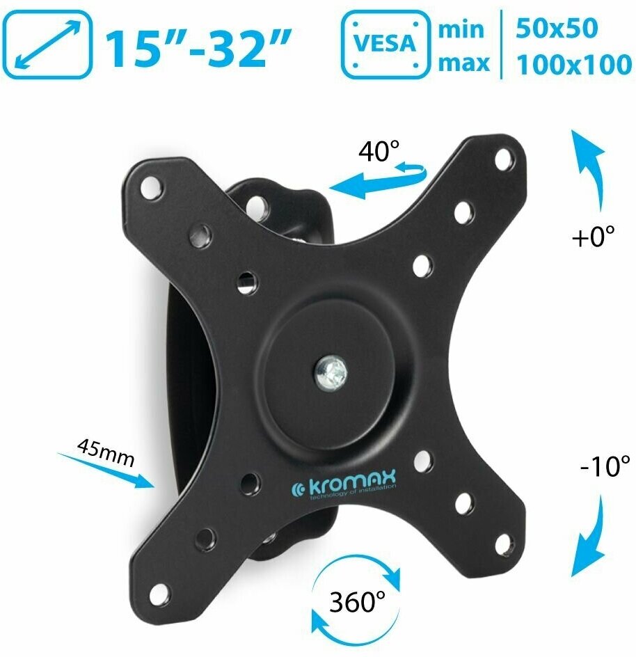 Лучшие цены. Удобный настенный кронштейн для LED/LCD телевизоров KROMAX GALACTIC-1 NEW BLACK надёжно удержит экран размером от 15"-32" дюйма и весом до 20 килограммов. Простая и интуитивно понятная конструкция настенного кронштейна для LED/LCD телевизоров KROMAX GALACTIC-1 NEW BLACK идеально подойдет для самостоятельного монтажа. Наклонно-поворотная регулировка позволит вращать экран на 360° в горизонтальной плоскости, наклонять вверх и вниз на -10°, поворачивать влево и вправо на 40°. Магазины в вашем городе.