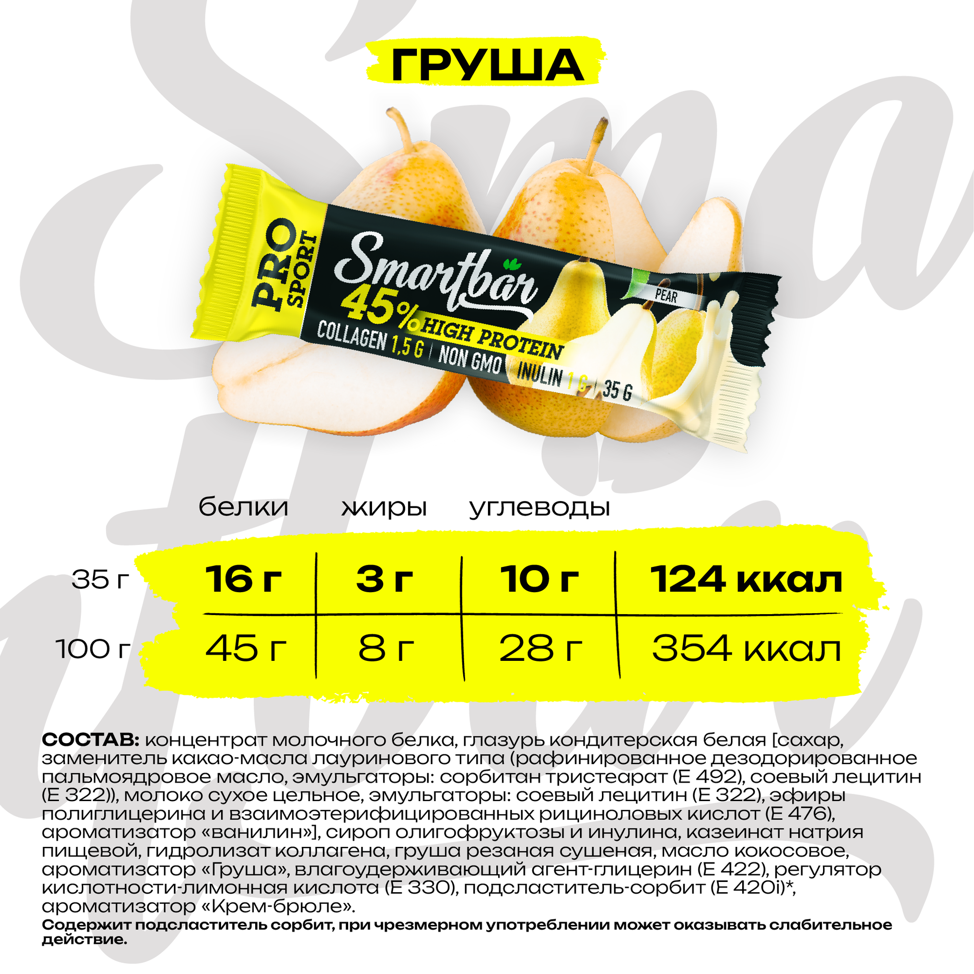 Протеиновый батончик SmartBar Protein Pro 45% "Грушевый" 35г (25шт) 955 ₽ Подробнее