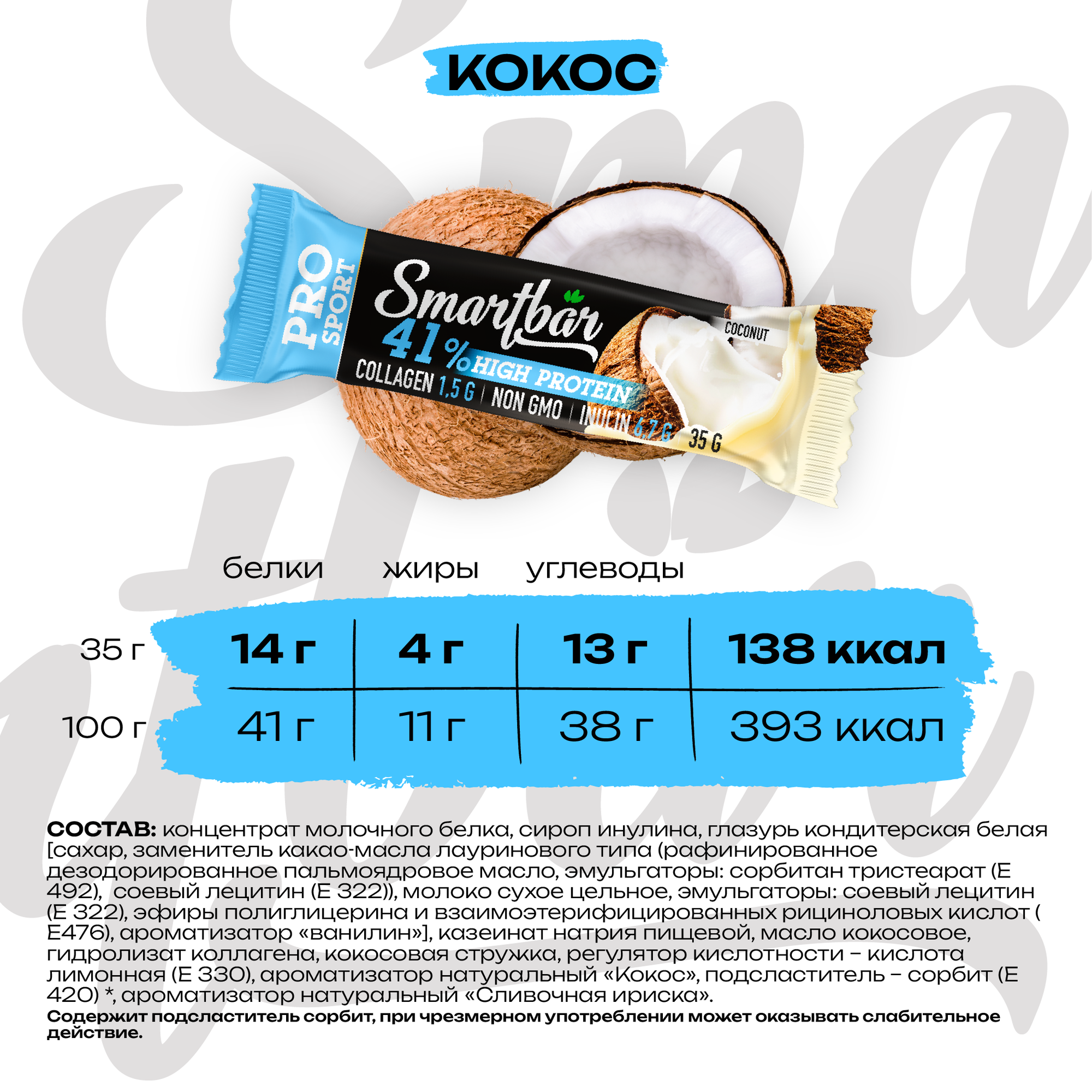Протеиновый батончик SmartBar Protein Pro 41% "Кокосовый" 35г (6шт) 330 ₽ Подробнее