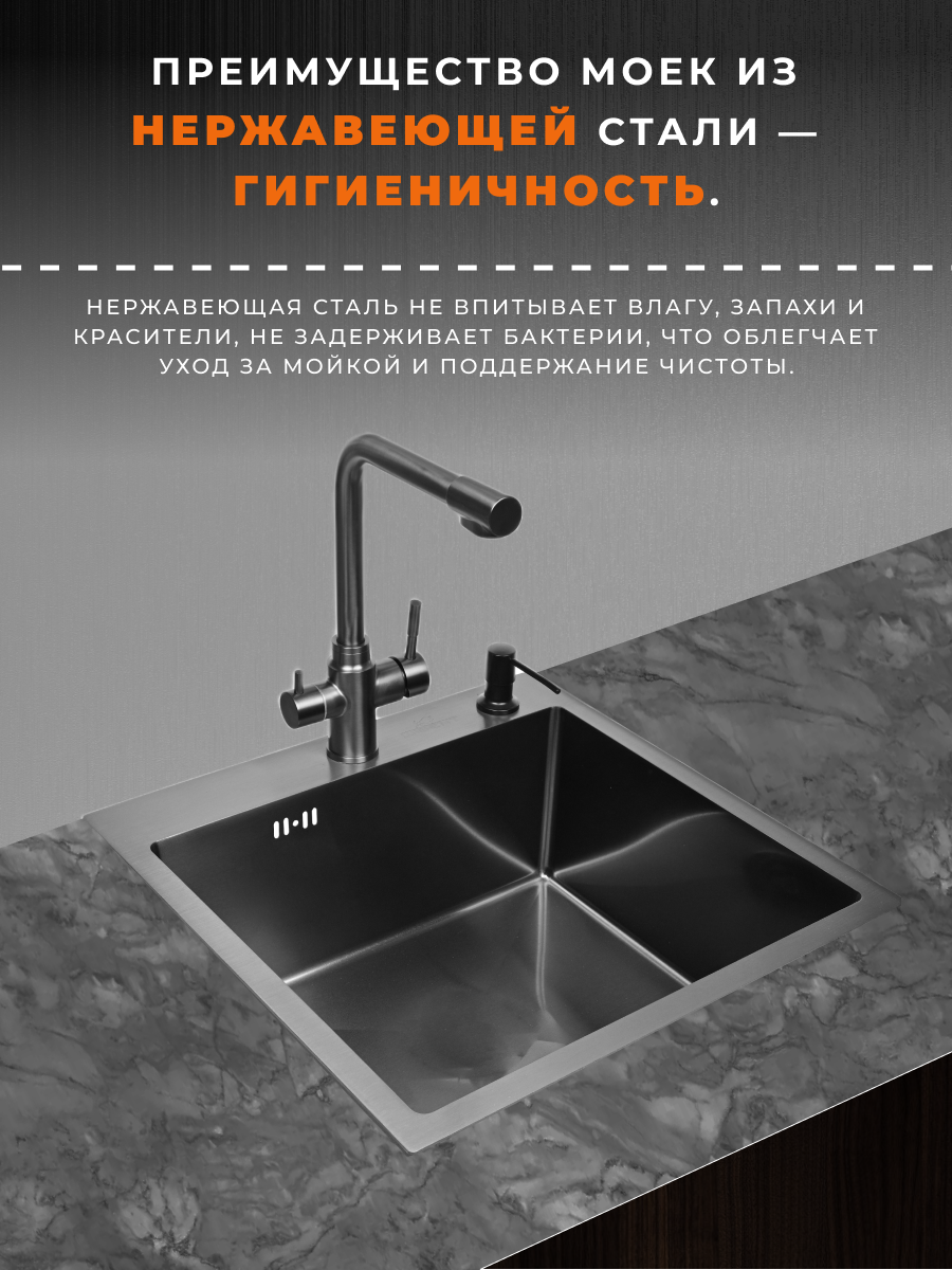 Комплект мойка для кухни нержавеющая врезная 50*50 с PVD покрытием с дозатором Wisent WS35050B/W405B/WGER010 14 009 ₽ Подробнее