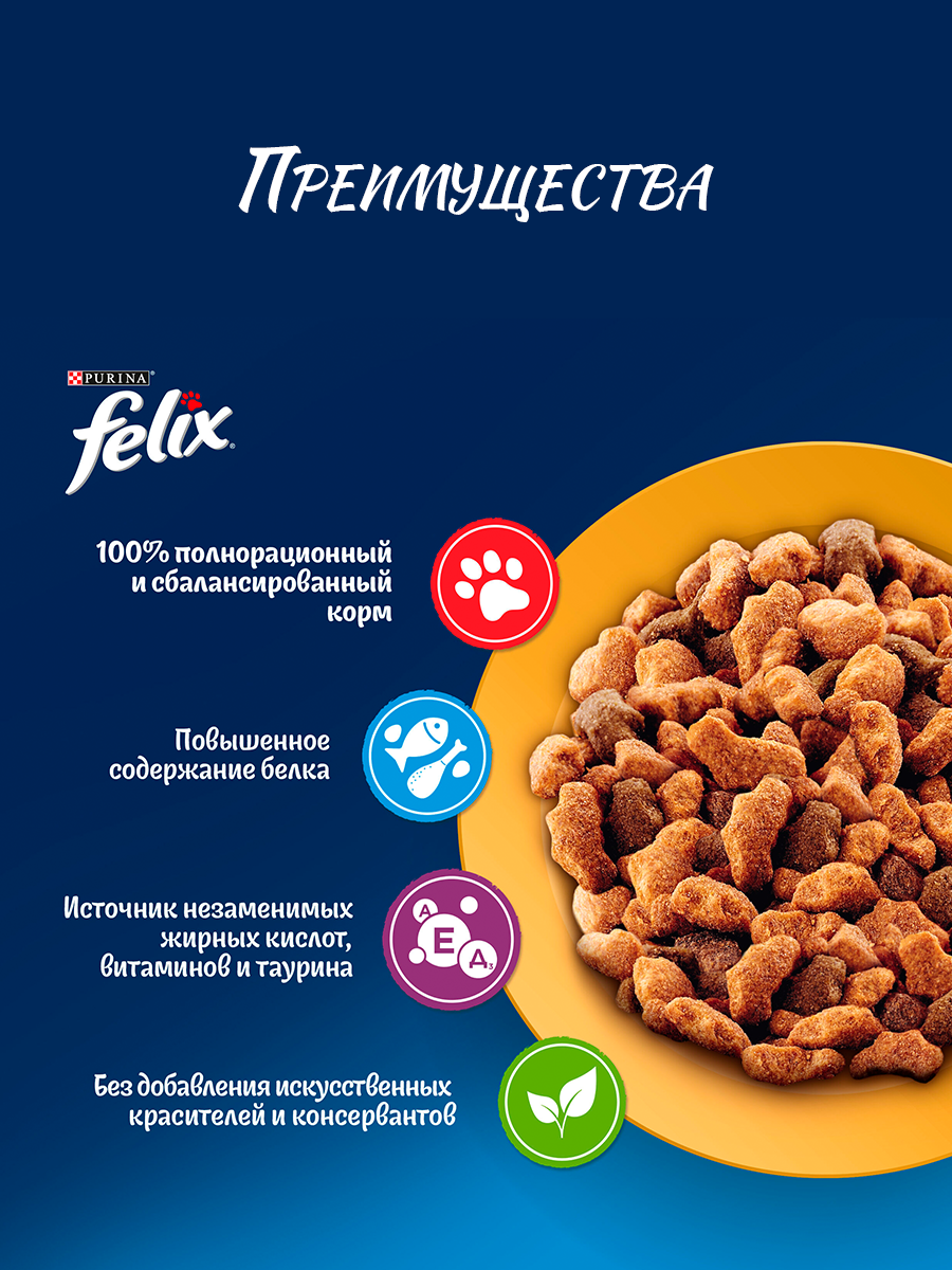 Корм для кошек сухой Felix / Феликс Мясное объедение для взрослых животных, гранулы с курицей 1.3кг / кошачья еда для ежедневного кормления 884 ₽ Подробнее