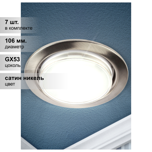 (9 шт.) Светильник точечный ЭРА KL35 SN eco для ламп с цоколем GX53, максимальная мощность ламп 15 Вт, питание 220 В, цвет сатин никель, размер 106x38 1 158 ₽ Подробнее