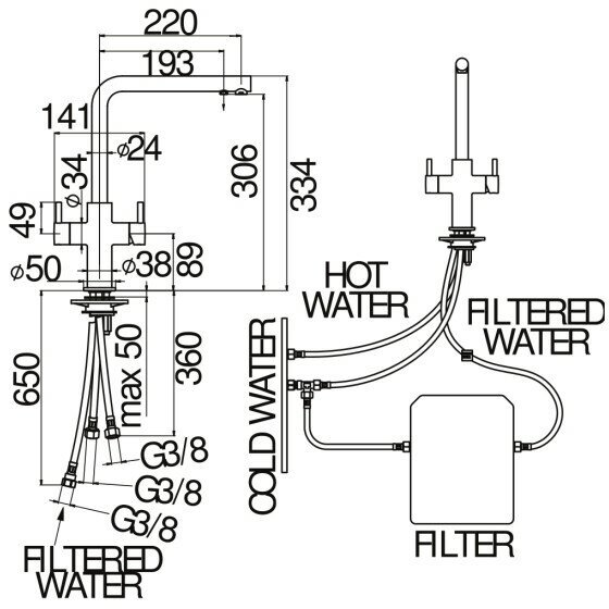 | Подвод воды | шланги / 360 мм / G 3/8" |