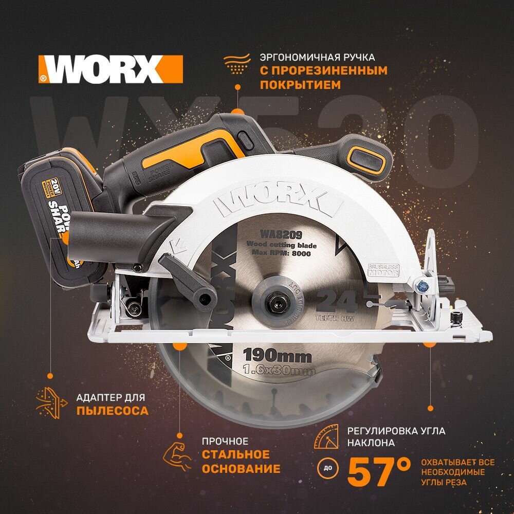 Пилы Циркулярная пила аккумуляторная бесщеточная WORX WX520, 20В 190 мм, 4Ач х1, ЗУ 2А, сумка, коробка
