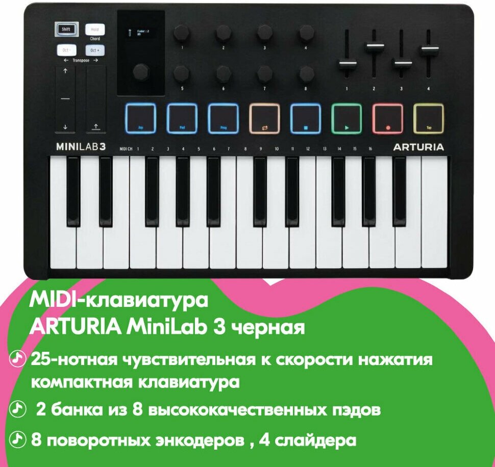 Arturia MiniLAB 3 Deep Black - 25 клавишная MIDI-клавиатура - пэд-контроллер, 9 регуляторов, 8 RGB пэдов, 8 фейдеров, дисплей, сенсорные регуляторы Pitch/Modulation, MIDI-выход, 1/4" Jack вход педали, режим Chord, арпеджиатор, USB-C, ПО 16 994 ₽ Подробнее