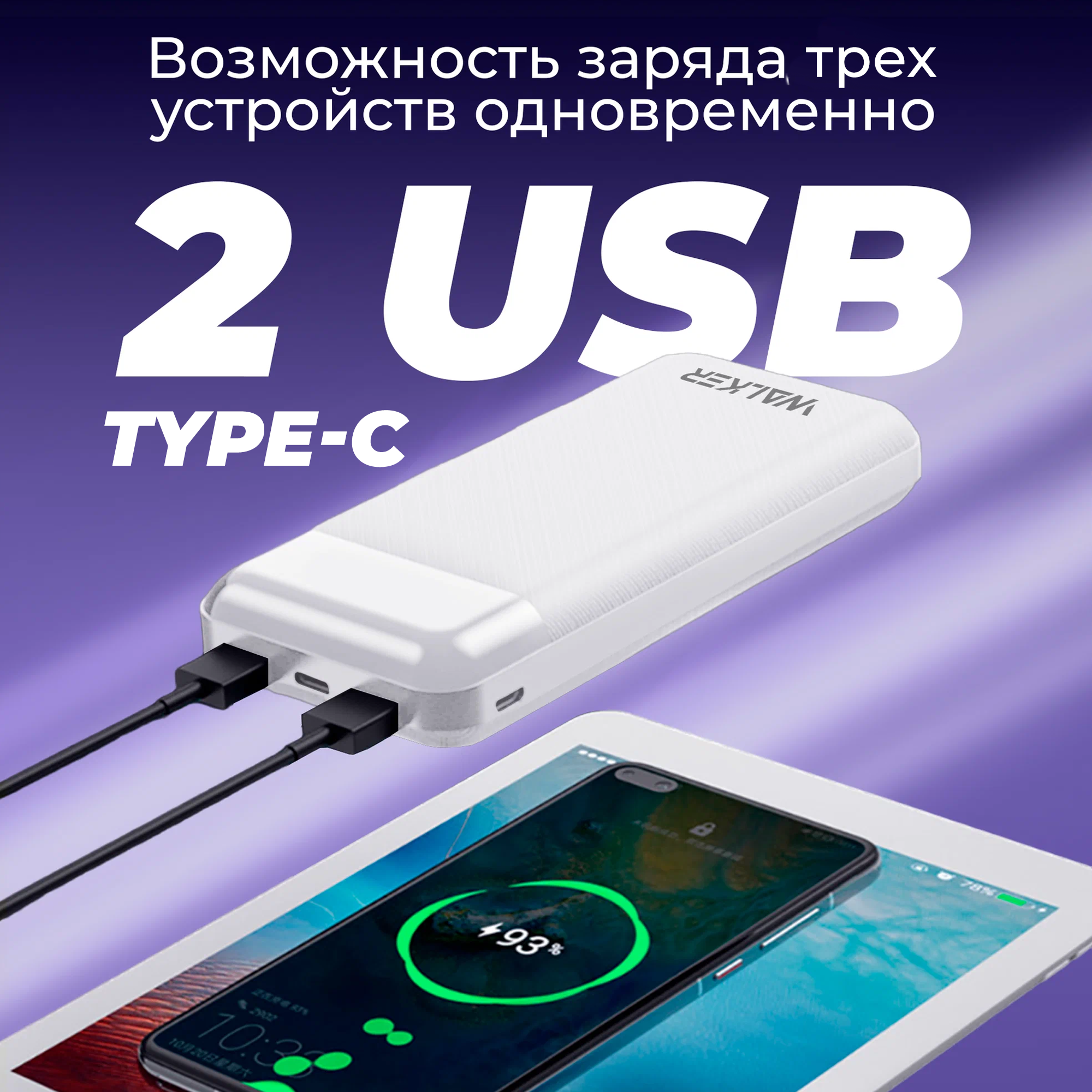 Портативный внешний аккумулятор 20000 mAh, разъемы Type-C, microUSB, USB, WALKER, WB-525, белый / powerbank, power bank на телефон, повербанк, банка