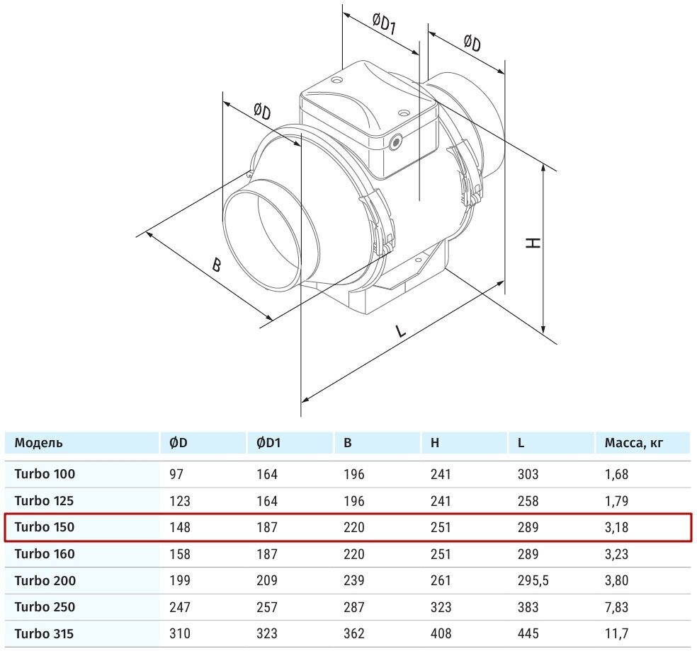 Вытяжные вентиляторы Канальный вентилятор смешанного типа Blauberg Turbo 150