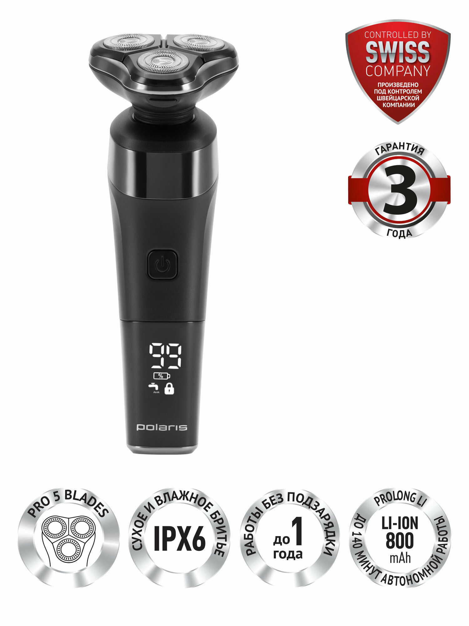 Электробритвы Бритва электрическая Polaris PMR 0308RC wet&dry PRO 5 blades+