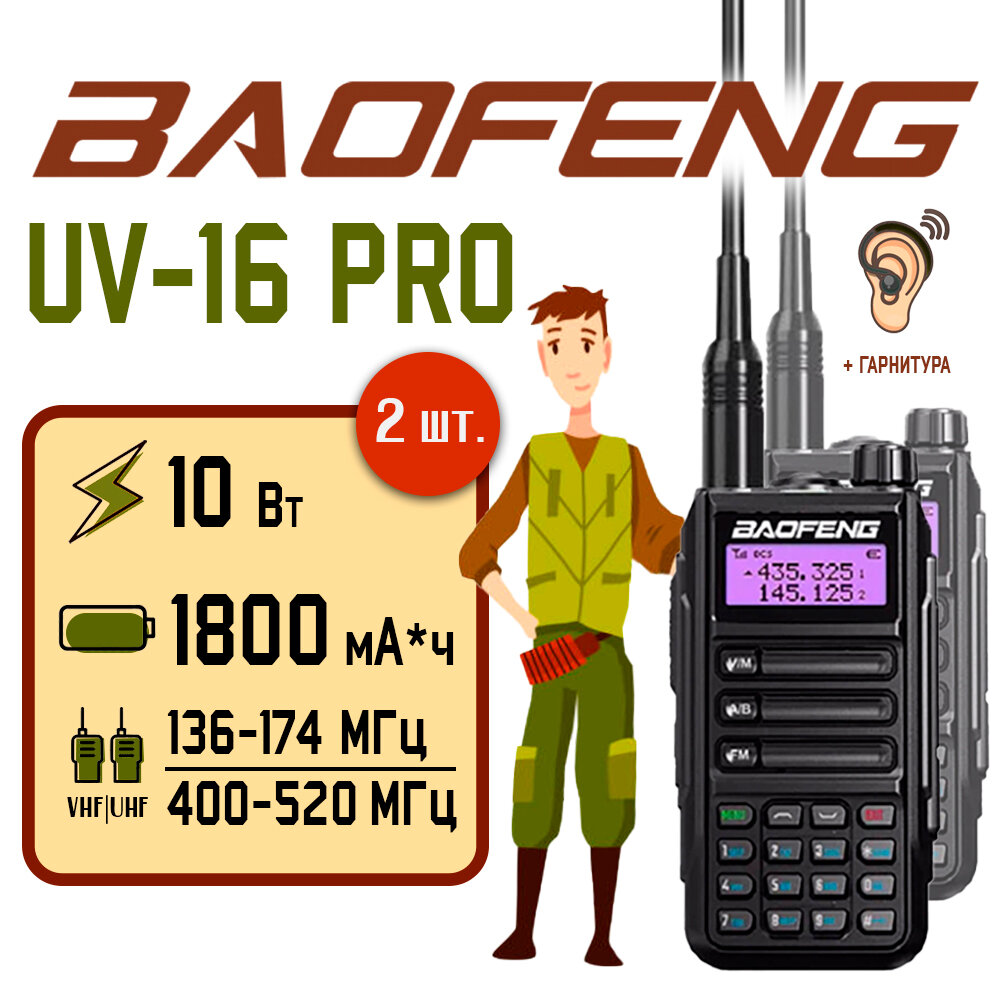 Рации Портативная радиостанция Baofeng UV-16 Pro 10 Вт / Черная комплект 2 шт / UHF; VHF