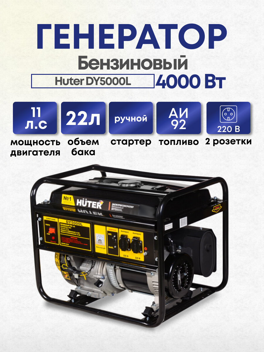 Электрогенератор DY5000L Huter бензиновый (ручной стартер) ( АИ-92, топливный бак 22 л; 11 л.с.; макс.мощность 4,5 кВт)