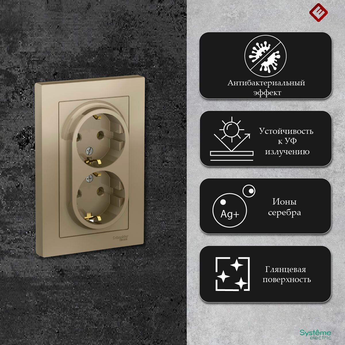 10 шт. Systeme Electric AtlasDesign Изумруд, Розетка c заземлением со шторками, 16А, механизм, ATN000845 5 423 ₽ Подробнее