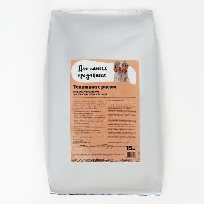 Корм для собак Для самых преданных, гипоаллергенный корм Д/собак всех пород, телятина С рисом 15 кг