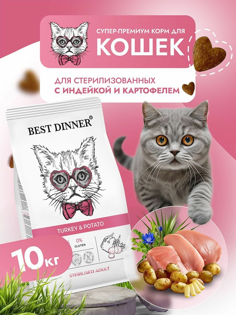 Корм для кошек Корм сухой для стерилизованных кошек с индейкой и картошкой при чувствительном пищеварении и аллергии 10кг Best Dinner (Бест Диннер)