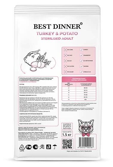 Best Dinner Adult Sterilised Turkey & Potato сухой корм для взрослых кастрированных и стерилизованных кошек, склонных к аллергии и проблемам с пищеварением с индейкой и картофелем - 1,5 кг