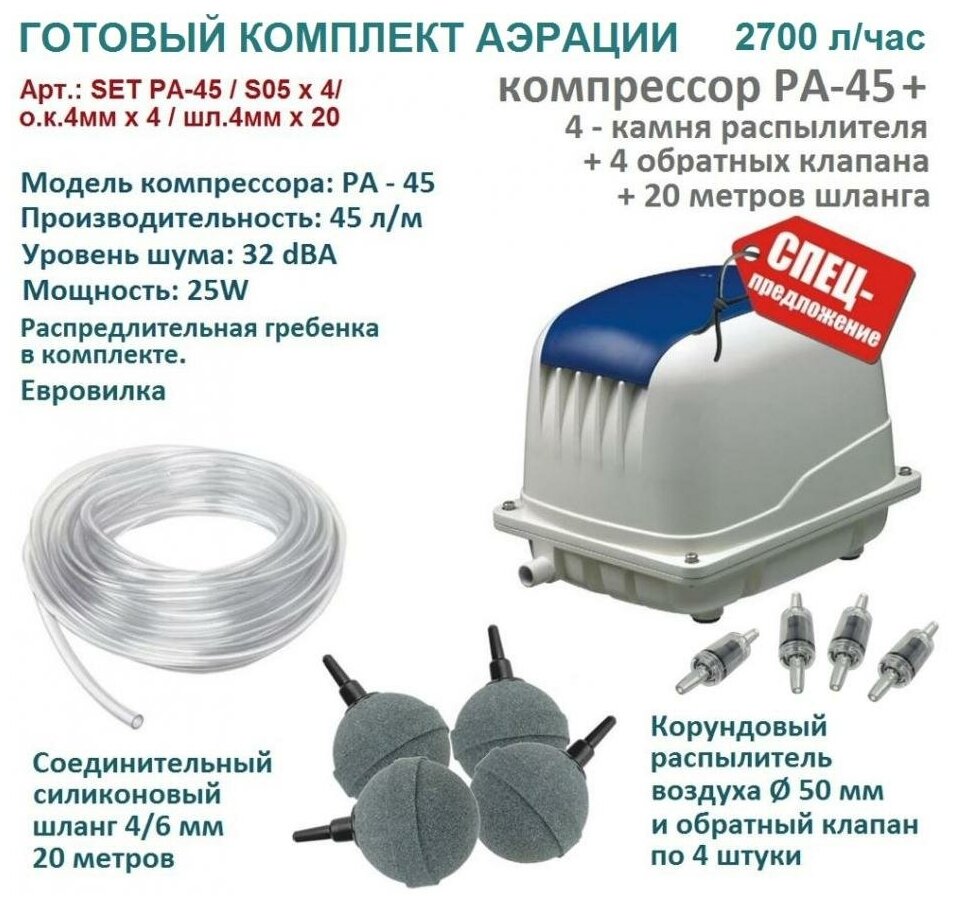 Аэратор Комплект аэрации для пруда и септика компрессор PA 45 + аэраторы S05x4 + о.к. 4ммх4 + шланг 4ммх20м