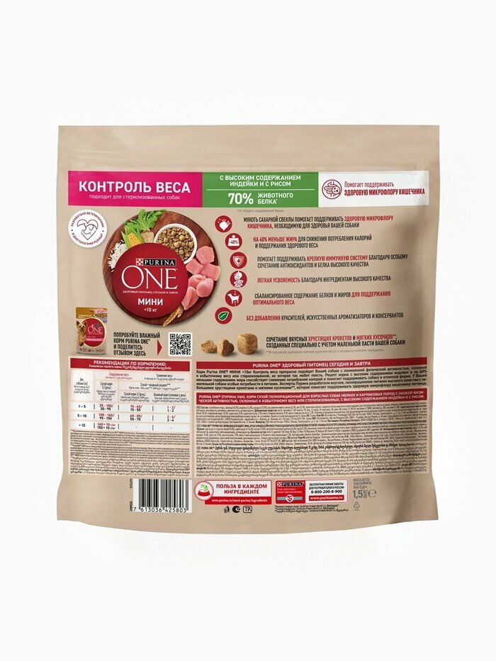 PURINA ONE мини здоровый ВЕС для взрослых собак маленьких пород с индейкой и рисом (1,5 кг)