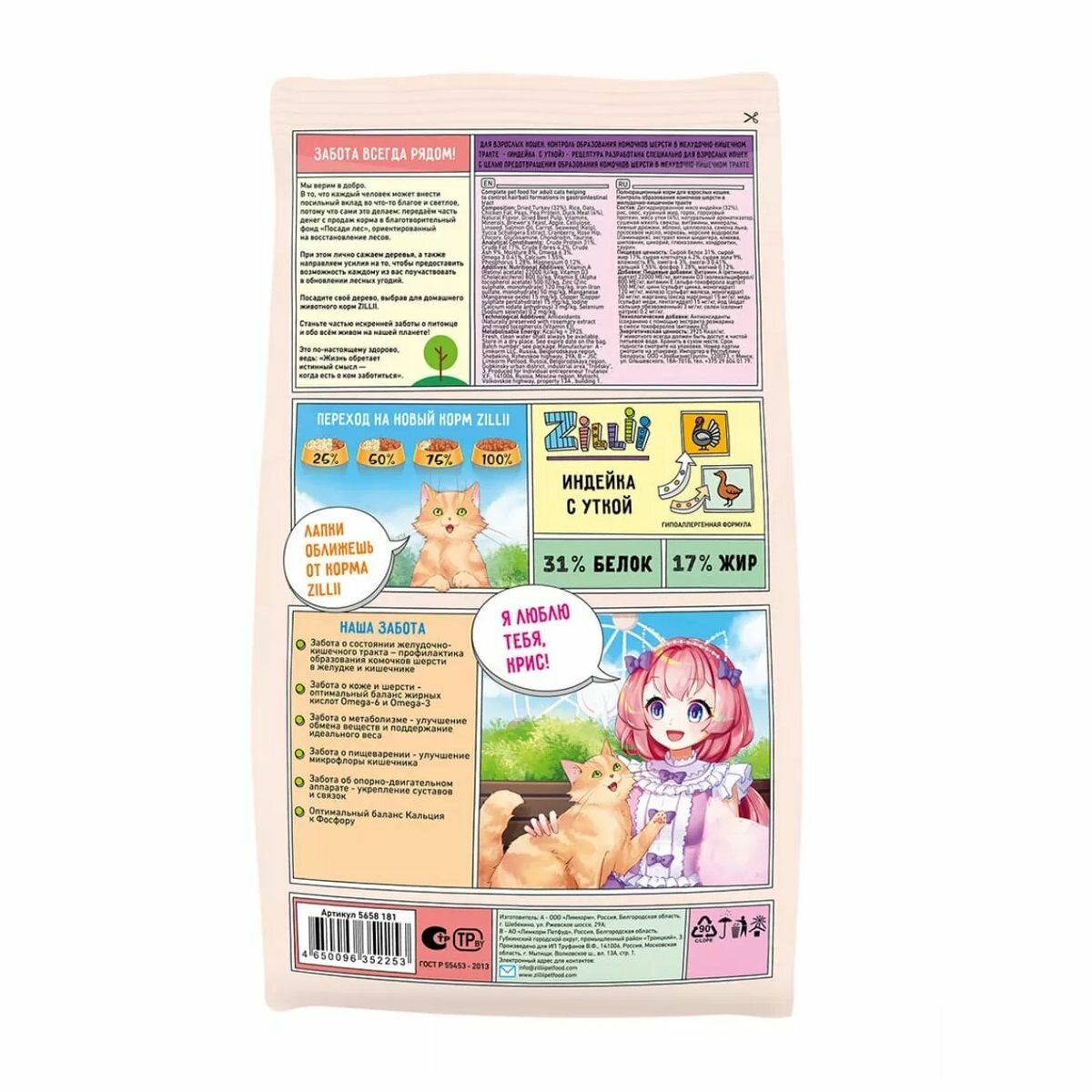 Корм для кошек ZILLII Hairball Control Для взрослых кошек, контроль образования комочков шерсти в желудке, Индейка Утка, 2кг