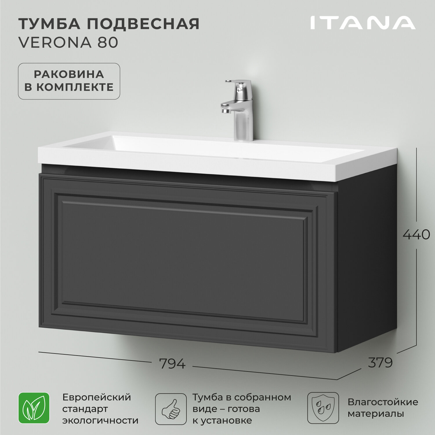 Тумбы под умывальник Тумба с раковиной в ванную, тумба для ванной Итана Verona 80 794х379х440 подвесная Графит
