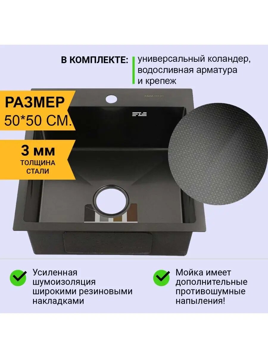 Мойка нержавеющая врезная 50х50 графит FABIA Profi (3.0х200) выпуск 3 1/2 с сифоном, с коландером 13 312 ₽ Подробнее