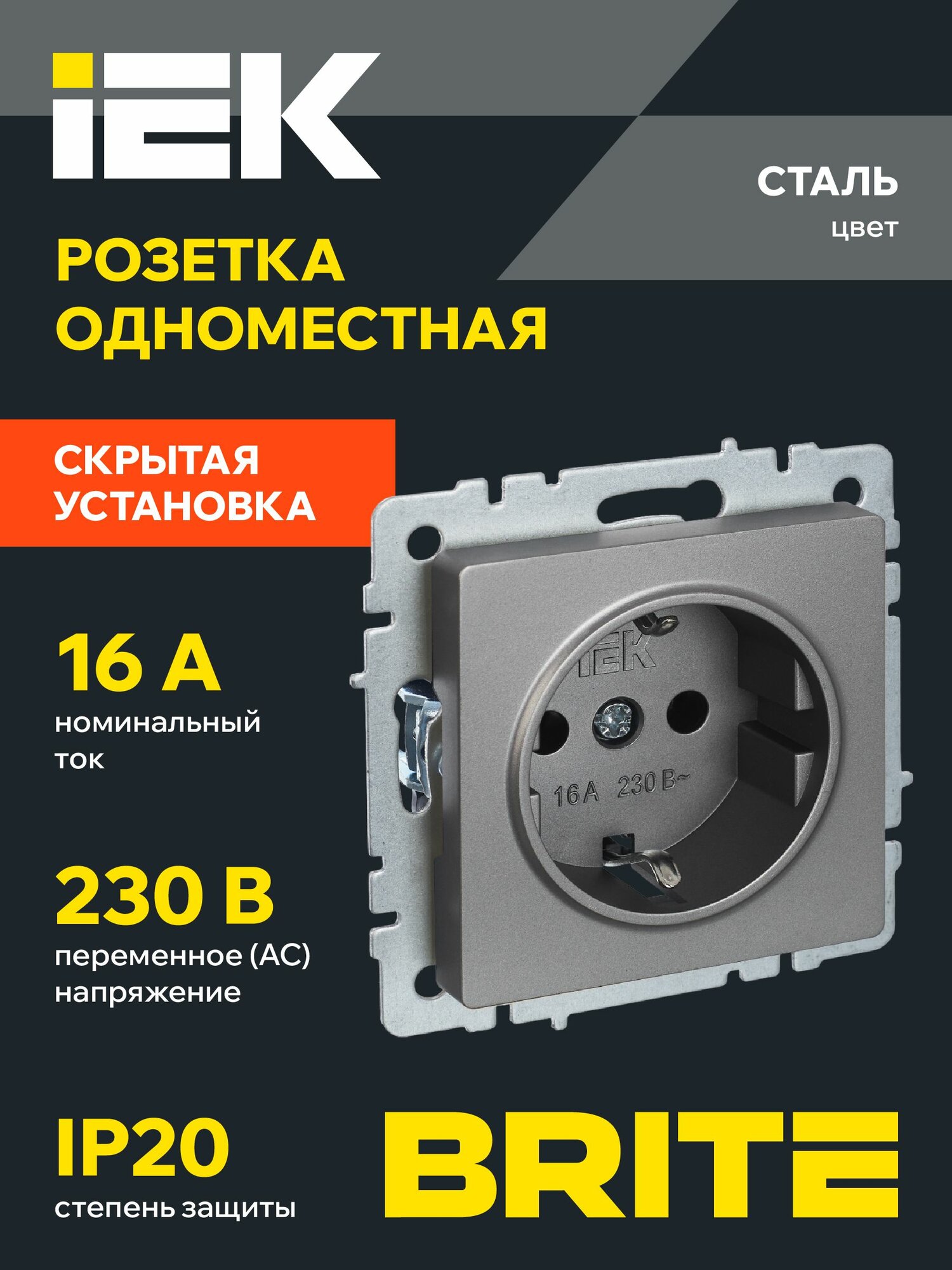 BRITE Розетка с з/к без з/ш 16А РС11-1-0-БрС сталь IEK 237 ₽ Подробнее