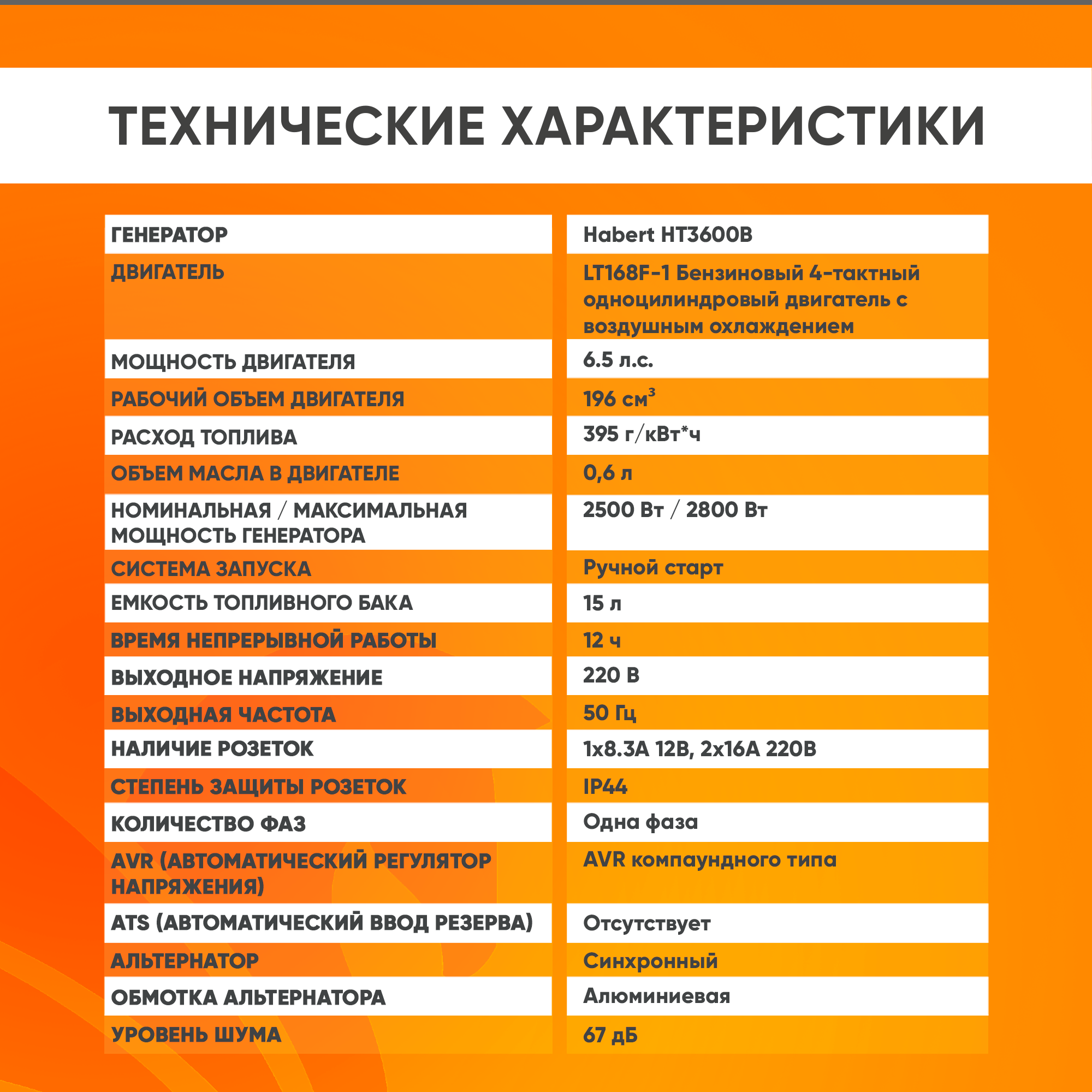Генераторы Генератор бензиновый однофазный Habert HT3600B 2.8кВт 220В бак 15л