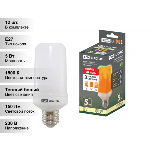Лампочки (12 шт.) Светодиодная лампочка TDM Т65 5Вт 230В 1500К E27 "Эффект пламени"