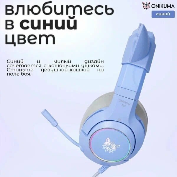Наушники Игровые наушники с кошачьими ушками, Onikuma X10 для компьютера с микрофоном, PC, Голубой