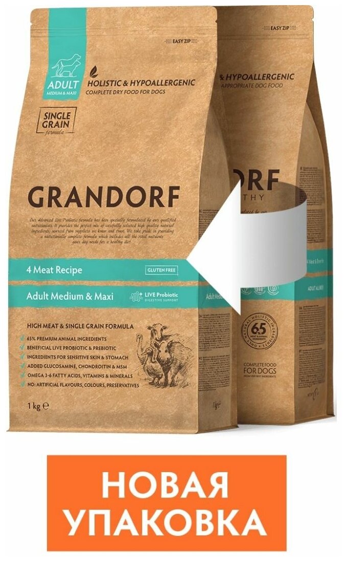 Сухой корм для собак GRANDORF 4 Meat Recipe Adult Medium and Maxi средних и крупных пород 4 вида мяса с живыми пробиотиками 1 кг